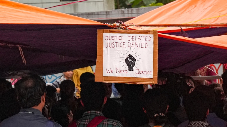 #WATCH | RG Kar Medical College & Hospital rape-murder incident | Junior doctors continue their protest for the fourth consecutive night,amid rain at Swasthya Bhawan,in the Salt Lake area of West Bengal's Kolkata. pic.twitter.com/7D7dXkAInE