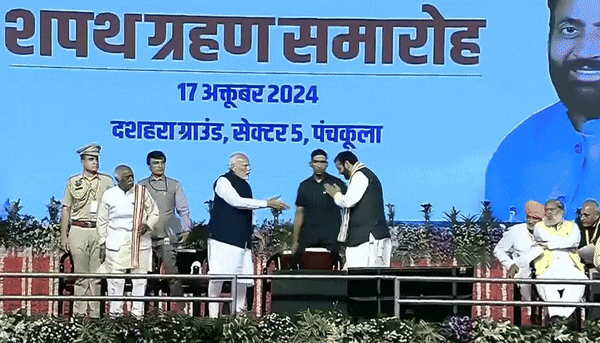 हरियाणा (Haryana) में लगातार तीसरी बार भारतीय जनता पार्टी की सरकार बन गयी है. नायब सिंह सैनी ने गुरुवार को मुख्यमंत्री पद की शपथ ली. समारोह में पीएम मोदी,केंद्रीय मंत्री अमित शाह और राजनाथ सिंह समेत 20 राज्यों के मुख्यमंत्री मौजूद थे. शपथ ग्रहण समारोह पंचकूला के सेक्टर 5 स्थित परेड ग्राउंड में आयोजित किया गया था. सीएम पद की शपथ लेने के बाद नायब सिंह सैनी ने पीएम मोदी का आर्शिवाद लिया.