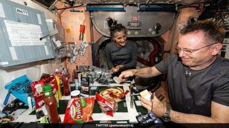सोशल मीडिया पर वायरल हो रही तस्वीर में सुनीता विलियम्स को ISS में अपने दोस्तों के साथ पिज्जा और चिप्स खा रही हैं. तस्वीर में विलियम्स पहले से ज्यादा कमजोर दिख रही हैं. ऐसा लगता है कि उनका वजन काफी घट गया है. गाल भी पिचके हुए दिख रहे हैं.
