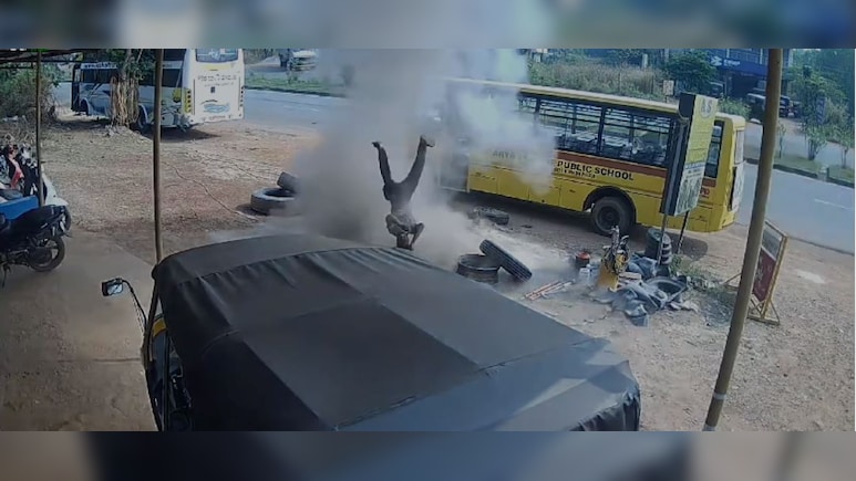 कर्नाटक के उडुपी से एक दिल दहलाने वाला वीडियो सामने आया है. जिसमें एक बस का टायर मरम्मत के दौरान फट गया.विस्फोट इतना शक्तिशाली था कि19 वर्षीय अब्दुल राजीद जो किनिजी स्कूल बस के टायर की पंचर की मरम्मत कर रहा था वो हवा में उड़ गया. अब्दुल कई फीट ऊपर उछल गया. इस घटना का एक वीडियो भी सामने आया है जो की तेजी से वायरल हो रहा है. वीडियो में दिख रहा है कि अब्दुल राजीद टायर की मरम्मत कर रहा है,तभी विस्फोट हो गया और अब्दुल राजीद हवा में उड़ गया.