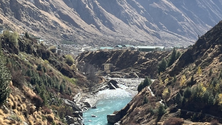 यह फोटो 17 नवंबर 2024 को माना गांव के भीम पुल से ली गई थी इस फोटो में सरस्वती नदी और अलकनंदा नदी का संगम साफ दिख रहा है. इसके अलावा तस्वीर में ऊंचे पहाड़ अभी साफ दिख रहे हैं जिन पर बर्फ नहीं है. लाल रंग से एरो मार्क किया गया है.