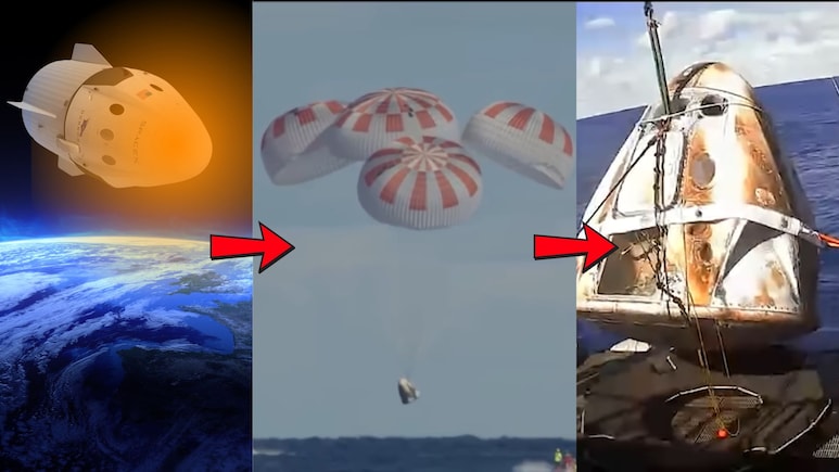 अब बारी आएगी पैराशूट की. शुरू में दो पैराशूट खुलेंगे और वो ड्रैगन कैप्सूल की रफ्तार को कम करेंगे. इसके बार पैराशूट की संख्या 4 हो जाएगी और कैप्सूल की रफ्तार कम होकर 24 किमी प्रति घंटे तक आ जाएगी. इसी रफ्तार से कैप्सूल समुंदर में गिरेगा.