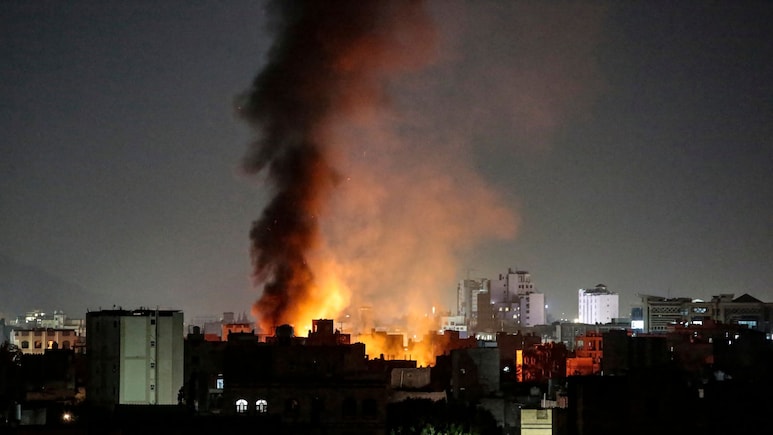 यमन की राजधानी सना पर बमबारी के बाद इमारतों से उठता धुएं का गुबार