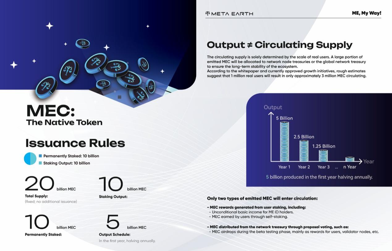 MEC टोकन की आपूर्ति 20 बिलियन यूनिट्स तक सीमित है, जिसमें से 50% स्थायी रूप से लॉक रहेगा और बाकी 50% सालाना हाफिंग के साथ स्टेकिंग रिवॉर्ड्स के माध्यम से जारी किया जाएगा। उपयोगकर्ता इकोसिस्टम में योगदान देकर अतिरिक्त पुरस्कार भी अर्जित कर सकते हैं, जिससे व्यक्तिगत भागीदारी को नेटवर्क वृद्धि के साथ जोड़ा गया है।